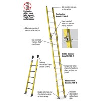 The S7900 series is a Fiberglass Tappered Sectional Ladder with a base, middle and top section that can be combined to reach to reach 12', 16', or 20' lengths. Durable rail shields and shoe brackets protects the rail from damage. TRACTION-TRED round rungs are slip resistant, and the exclusive ALFLO rung joint means TWIST-PROOF performance every time. These ladders are made of non-conductive fiberglass rails and have a duty rating of 375 pounds.